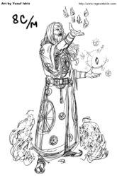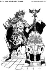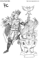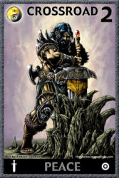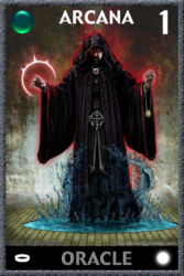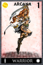 Mais le jeu était réellement original. Pour commencer, j’ai fait en sorte que les cartes fassent partie de l’univers de Rage. Non pas les personnages dessinés sur les cartes, mais les cartes elles-mêmes. J’ai donc inventé une histoire spécifiquement pour les cartes, avec un nouveau personnage appelé Khain Alhazred, personnage issu de la partie égyptienne de l’univers de Rage à l’origine de la création d’un jeu de Tarot magique. Khain Alhazred a le pouvoir de montrer aux personnages une scène du passé, du présent ou du futur. Il suffit au personnage de jouer une partie contre lui, trouver la carte à son effigie, et la combiner avec la bonne Arcane (l’une des cartes à 1 point).